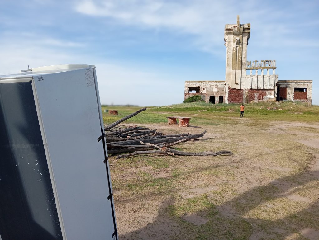 Luigi Brisso Pifferi faces the monumental Epecuén Slaughterhouse by architect Salamone, a classic of the 1930s.